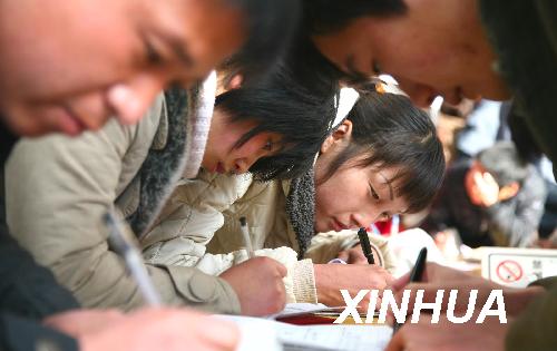 2009年2月16日,畢業生在招聘會現場填寫應聘表格。當日,北京市懷柔區舉辦“首都人才市場促進高校畢業生就業服務月懷柔區現場招聘會”,為畢業生們提供千余就業崗位。新華社發(卜向東 攝)