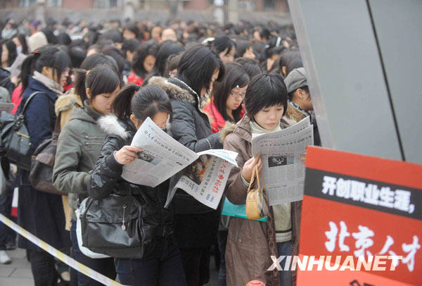 3月4日,參加招聘的女大學生在北京市畢業生就業市場排隊等候入場。當日,北京市2009年女大學生專場招聘會在北京市畢業生就業市場舉辦,北京各行業近50家企事業單位共推出600余個崗位,吸引了5000多名女大學生入場。據介紹,這是北京市連續第5年舉辦女大學生專場招聘會。主辦方表示,此次進場的所有崗位都是針對女大學生設立。2009年北京地區將有高校畢業生21萬余人,北京生源畢業生達到9萬多,其中女大學生比例超過五成。新華社記者 羅曉光攝
