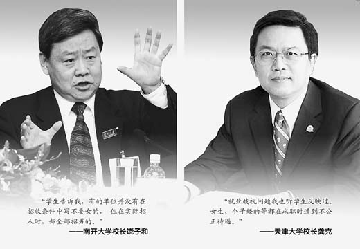在今年初舉行的天津市人代會上,天津市人大代表王麗萍律師呼吁盡快出臺措施緩解女大學生就業難。她認為,女大學生就業難,有生理和心理兩方面的因素: