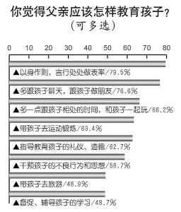 父親應(yīng)該怎樣教育孩子?排在首位的是“以身作則,言行處處做表率”,79.5%的人選擇此項(xiàng)。接下來(lái)還包括:多跟孩子聊天,跟孩子做朋友(76.6%);多跟孩子相處,和孩子一起玩(66.2%);帶孩子去運(yùn)動(dòng)鍛煉(63.4%);指導(dǎo)教育孩子的禮儀、道德(62.7%);干預(yù)孩子的不良行為和思想(58.7%);帶孩子去旅游(48.7%);督促、輔導(dǎo)孩子的學(xué)習(xí)(43.4%)。