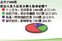 搜狐山東網友:很作秀,很搞笑。以往都是一位女子征婚,現在是捆綁銷售了,市場經濟的魔力可見能摧枯拉朽啊。從八名美女碩士集體征婚動機來分析:一、借征婚之名進行炒作,現在大學生就業難,研究生也概莫能外;二、借征婚之名向有錢人推銷自己,不論能當正房還是偏房,衣食無憂足矣,起碼少奮斗二十年;三、莫非是想仿效芙蓉姐姐嗎?