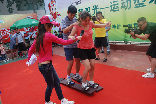 幼兒組的比賽口號為“全運在身邊,家庭總動員”,一家三口分別經(jīng)過“火線追擊”(幼兒獨立完成)——“凌波微步”(媽媽獨立完成)——“勢在臂行”(爸爸獨立完成)——“步調(diào)一致”(一家三口共同完成)四個環(huán)節(jié),用時短的獲得優(yōu)勝。