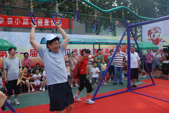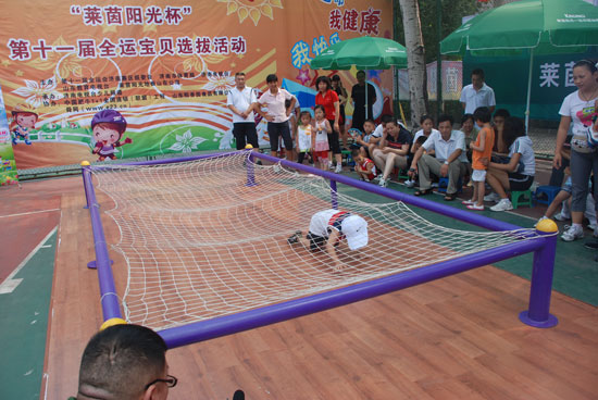 少兒組的比賽口號為“全運寶貝向前沖,健康快樂伴我行”,由少兒獨立完成以下四個環(huán)節(jié):“穿越火線”——“百發(fā)百中”——“跳動全運”——“勇攀高峰”,用時短者獲得優(yōu)勝。