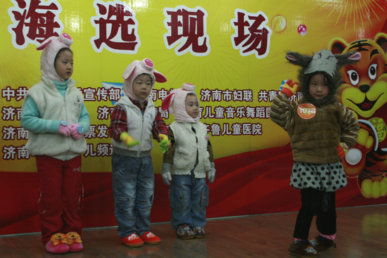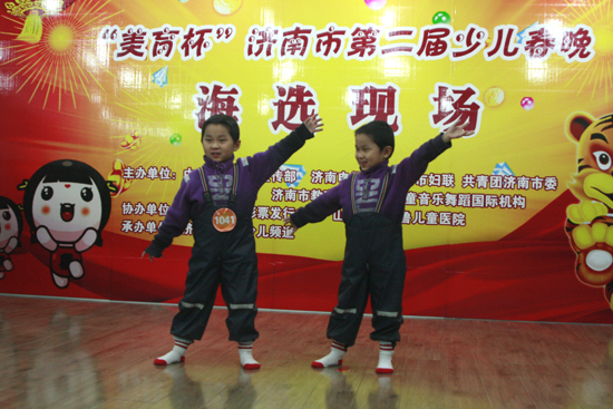“坐在家里看春晚,不如登臺自己演”。 2009年12月12日,“放飛夢想童賀虎年”——“美育杯”濟南市第二屆少兒春節聯歡晚會節目海選正式開始了! 位于美育兒童音樂舞蹈國際教育機構的幼兒組海選現場,位于濟南電視臺600平米演播室的少兒組海選現場全部人滿為患,據粗略統計,第一天兩個海選場地共接待了超過300名的參賽兒童,節目質量也較去年有了很大程度的提高。值得一提的是,3G技術在海選現場的運用,讓觀眾朋友們可以隨時隨地,通過網絡和手機觀看本次少兒春晚海選。
