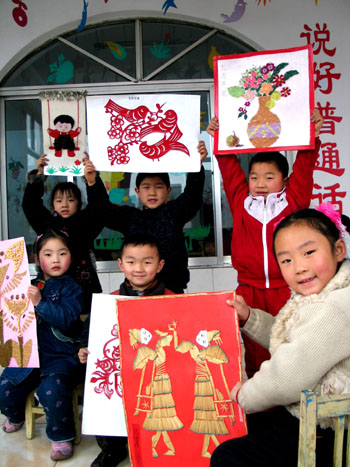 Children display greeting cards they made at a kindergarten in Zouping, east China's Shandong Province January 25, 2007. They made the cards with rags, colored papers, and matches to celebrate the upcoming Lunar New Year.