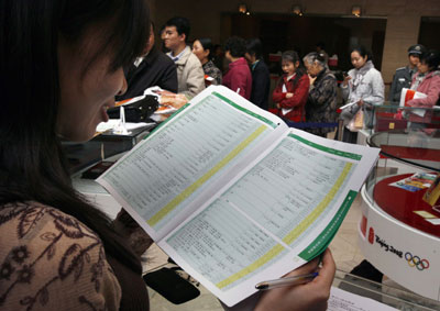 A woman looks at a brochure as she waits in line to purchase tickets for next year's Olympic Games, at the headquarters of the Bank of China in Beijing October 30, 2007. [Agencies]