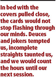 In his Lijiang bar, Bob Marley posters loomed above while we played late into the night. Julia and I would eventually surrender to exhaustion and walked home by the light of our cell phone LCD screens. In bed with the covers pulled close, the cards would not stop flashing through our minds. Deuces and jokers tempted us, incomplete straights taunted us, and we would count the hours until our next session.
