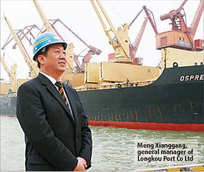 "The port will be built into a regional distribution center at Bohai Bay for coal and a trans-shipment center for petroleum, chemicals, grain and minerals," said Meng Xianggang, general manager of Longkou Port Co Ltd.