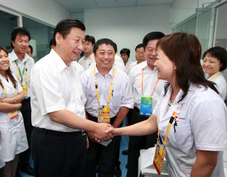 Chinese Vice President Xi Jinping (C) shakes hands with a drug supervisor for the Olympic Games, in Beijing, capital of China, July 21, 2008. Xi inspected the security work, medias operation and drug supervision for the upcoming Olympic Games Monday. [Xinhua]