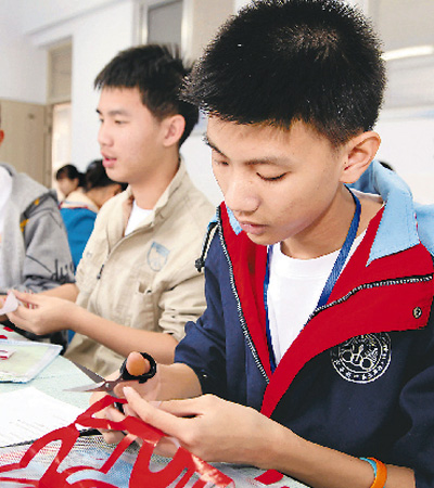 Yong Qi, a youth from Thailand, learns to cut paper at a primary school in Zaozhuang, Shandong Province on April 20, 2011. A total of 78 youth of Chinese origin from the Philippines, Thailand and South Korea, arrived in Zaozhuang to learn paper cutting and Chinese language, as part of a spring "root seeking" camp.