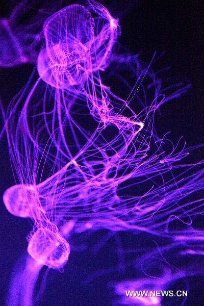 | Jellyfish float through their basin at Qingdao Aquarium in Qingdao, east China's Shandong Province, May 15, 2011. The Aquarium presents four different species of jellyfish as of now. (Xinhua/Niu Shupei) |
