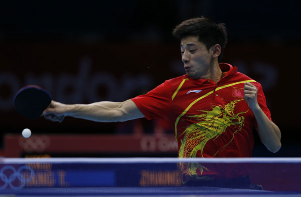 Zhang's teammate Wang Hao, seeded No. 2, comfortably booked a seat in the semifinal after beating Seiya Kishikawa in four straight sets (11-4, 11-5, 11-3, 11-5), dashing Japan's last hope of claiming an Olympic medal in table tennis singles events in London.