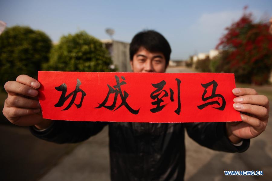 Zhao Guoguang, a Chinese engineer working at Shandong Electric Power Construction Corporation-III in Jhajjar Power Station, shows a Spring Festival decoration reading "success will come" in Jhajjar District of Haryana State, India, Jan. 23, 2014. As the Chinese Spring Festival is one week to go, more than 30 Chinese engineers from Shandong Electric Power Construction Corporation-III in Jhajjar Power Station in Haryana started to prepare for the festival during their work. The power plant, built by them, is in its warranty time, so the engineers need to work overseas during the festival time to ensure its safe operation. (Xinhua/Zheng Huansong)