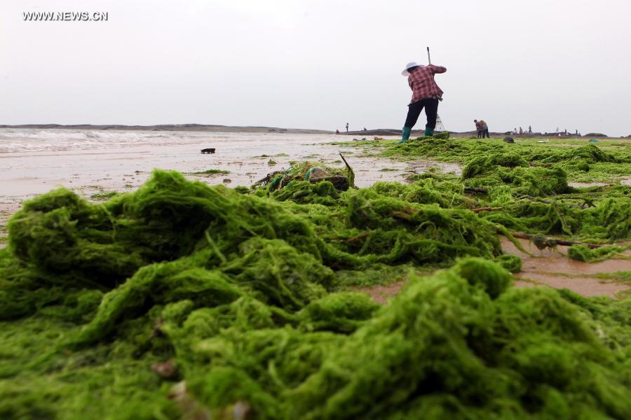 A woman clears up green algae on the beach in Rizhao City, east China's Shandong Province, June 10, 2014. An algae bloom, or "green tide," has broken out in waters off China's east coastline.