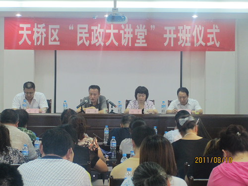 為認(rèn)真貫徹胡錦濤總書記在慶祝建黨90周年大會上的講話精神和中央、省、市關(guān)于加強(qiáng)和創(chuàng)新社會管理的戰(zhàn)略部署,進(jìn)一步推動“深入基層、服務(wù)群眾”活動扎實(shí)有效開展,探索建立區(qū)、街、居三級“一站式、全員化”民政服務(wù)新模式,天橋區(qū)民政局決定自8月初起到10月底,在全區(qū)民政系統(tǒng)開展“民政大講堂”系列學(xué)習(xí)活動,主要圍繞全區(qū)基層政權(quán)與社區(qū)建設(shè)、社會事務(wù)、救災(zāi)救濟(jì)、雙擁工作、優(yōu)撫工作、婚姻登記、黨風(fēng)廉政建設(shè)等各項(xiàng)民政重點(diǎn)工作,推行全區(qū)綜合民政事務(wù)“一站式、全員化”服務(wù)新模式。