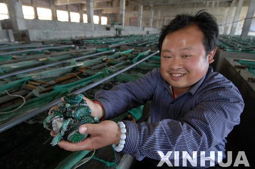 5月18日,工作人員在榮成市尋山集團鮑魚工廠化育苗車間展示培育的鮑魚苗。新華社記者 郭緒雷 攝