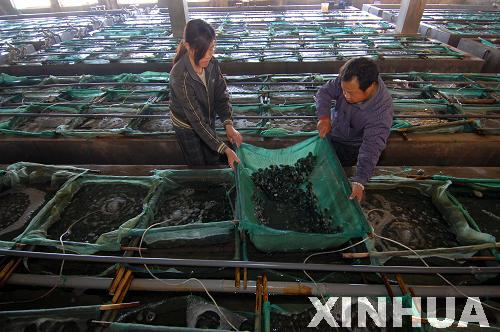 5月18日,工作人員在榮成市尋山集團鮑魚工廠化育苗車間查看鮑魚的生長情況。新華社記者