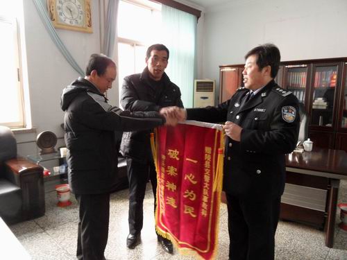 1月27日上午,“1.14”交通肇事逃逸案受害者家屬康某兩兄弟專程來到陵縣交警大隊,向交警大隊大隊長徐建剛及辦案民警贈送一面寫有“破案神速,一心為民”的錦旗,表達他們對交警迅速偵破交通肇事逃逸案的由衷謝意。在贈送錦旗和表達謝意時,受害人家屬康某表示,案件發生后,辦案民警對工作高度負責,發揮高超的破案能力,在幾乎無任何線索,家屬感到破案無望的情況下,民警通過各種手段迅速破案,從案件開始到破案僅僅用了16個小時,為受害者家屬伸張了正義,還了一份安寧。