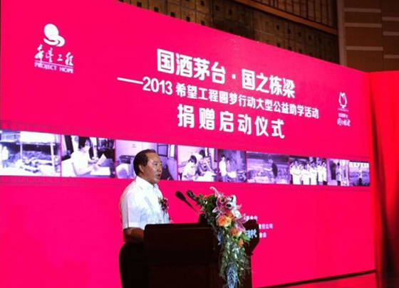 7月29日,中國(guó)青少年發(fā)展基金會(huì)、中國(guó)貴州茅臺(tái)酒廠(集團(tuán))有限責(zé)任公司聯(lián)合全國(guó)33家省級(jí)青少年發(fā)展基金會(huì)在北京大學(xué)隆重舉行“國(guó)酒茅臺(tái)·國(guó)之棟梁——2013希望工程圓夢(mèng)行動(dòng)”大型公益助學(xué)活動(dòng)捐贈(zèng)啟動(dòng)儀式,茅臺(tái)集團(tuán)董事長(zhǎng)袁仁國(guó)在現(xiàn)場(chǎng)發(fā)表講話。
