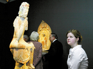 3月18日,在美國首都華盛頓史密森博物館開幕的中國青州石刻佛像展上,一位女性觀眾被一尊佛像所吸引。這次展出的35尊佛像是1996年在中國山東省青州龍興寺遺址出土的國寶級文物的一部分。