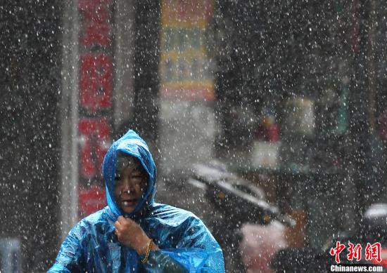 8月8日,受今年第11號臺風“海葵”登陸浙江沿海地區的影響,江蘇南部地區迎來大風大雨天氣,給當地的民眾出行造成不小的影響。圖為市民在暴雨如注的南京街頭經過。中新社發 泱波 攝