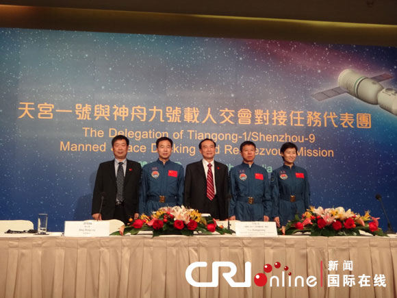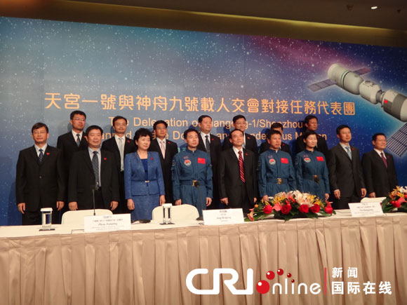 當(dāng)天下午,代表團(tuán)團(tuán)長(zhǎng)、中國(guó)載人航天工程副總指揮牛紅光,中國(guó)載人航天工程總設(shè)計(jì)師周建平,以及神舟九號(hào)三名航天員景海鵬、劉旺、劉洋與香港媒體見(jiàn)面。