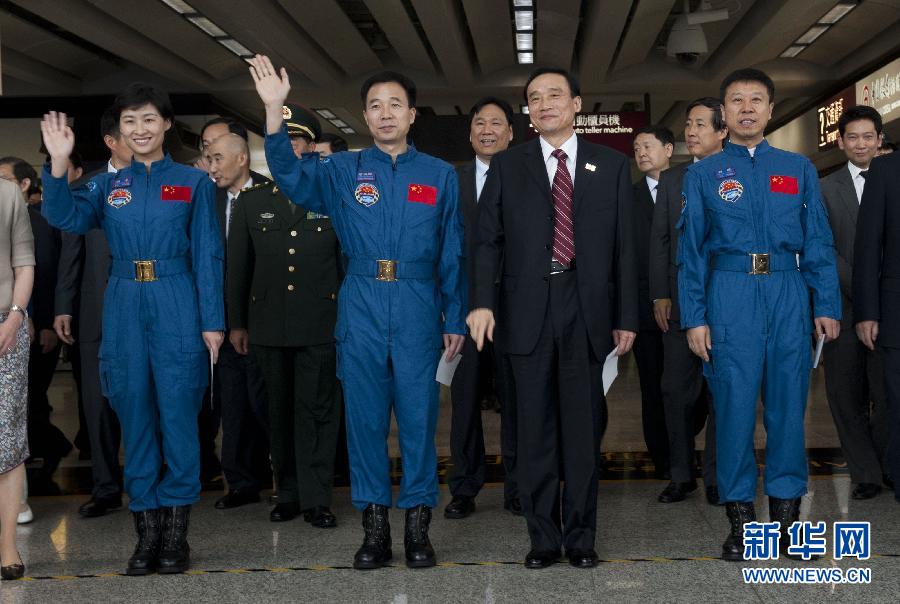 8月10日,航天員景海鵬(前右三)、劉旺(前右一)、劉洋(前左一)等代表團成員抵達香港國際機場。當日,天宮一號與神舟九號載人交會對接任務代表團抵達香港,開始為期4天的訪問。 新華社記者呂小煒攝