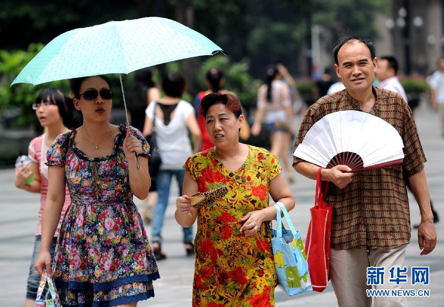 8月13日,幾位市民冒著高溫在解放碑逛街。連日來,素有“火爐”之稱的重慶市遭遇持續高溫天氣,最高氣溫維持在35℃以上。重慶市氣象臺于13日11時50分再次發布“高溫紅色預警”信號。這也是繼12日后,重慶今年第二次發布高溫紅色預警。預計今天12時到18時,該市潼南、渝北等地日最高氣溫將升至37℃以上,南岸、九龍坡、大渡口等地日最高氣溫將升至40℃以上。新華社記者 李健 攝