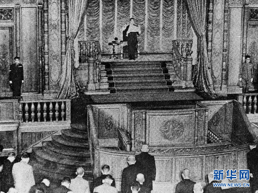 1945年8月15日,日本天皇裕仁廣播“終戰(zhàn)詔書”,宣布日本無條件投降。圖為日本天皇在議會(huì)宣布投降。 新華社發(fā)