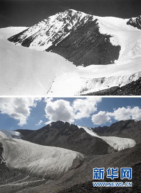 這張拼版照片顯示的是1983年拍攝的天山一號冰川一角(上圖)和2012年拍攝的天山一號冰川分離為東支與西支兩條獨立的冰川(下圖)。據中科院天山冰川觀測試驗站觀測數據顯示,隨著氣溫逐年升高,新疆天山一號冰川持續加速消融和退縮。 新華社發