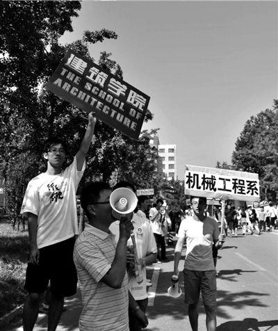 ③校園內,老生打著各系的牌子迎接師弟師妹。