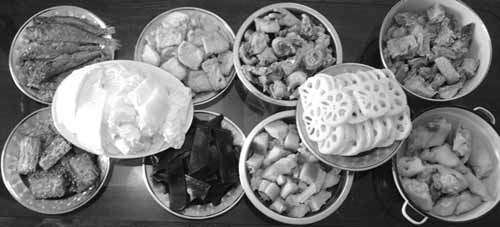 酥菜取料實在尋常:雞、肘子、鯽魚、白菜、海帶、藕、金針、雞蛋而已。它沒有福建“佛跳墻”那么珍貴,用魚翅、鮑魚、海參、干貝之類。它只是吾鄉平民的節日菜,帶樸素氣。
