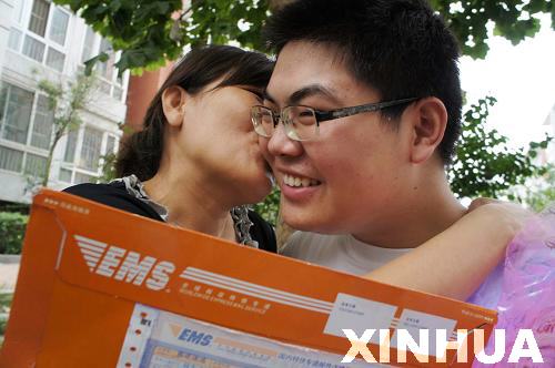 7月19日,宋延澤接到高校錄取通知書后,宋媽媽親吻兒子表示祝賀。(張憲舉 攝)