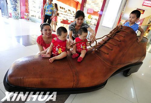 8月16日,在濟南一家鞋城內(nèi),孩子們在一輛“鞋車”上玩耍。