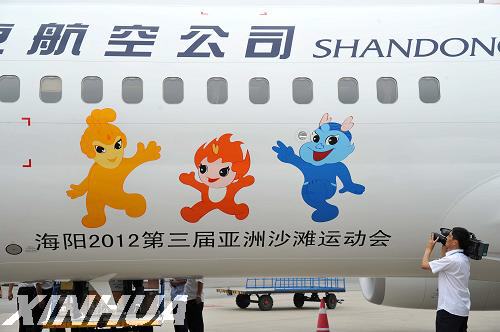 7月25日,“亞沙號”彩繪飛機抵達濟南遙墻國際機場。當日,“亞沙號”彩繪飛機在濟南遙墻國際機場正式亮相并舉行接機儀式。“亞沙號”采用波音737-800機型,機身噴繪有將于2012年在山東省海陽市舉辦的第三屆亞洲沙灘運動會的會徽、吉祥物和“快樂在一起”的口號。