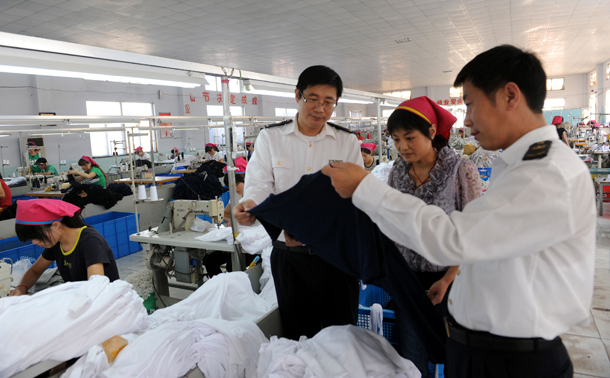 9月25日,日照檢驗檢疫局質(zhì)檢人員在日照德瑞行針織服裝有限公司檢查出口日本的服裝質(zhì)量。