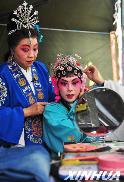 10月19日,鄒平縣呂劇團演員在演出前化裝。新華社發(董乃德 攝)