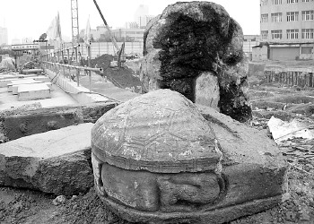 26日下午,位于濟南舜井街元代迎祥宮碑西側的施工工地,出土了幾塊殘破的古代石碑。僅其中的一塊雕有盤龍的碑首就高達1.6米,很是壯觀。據考古人員介紹,這么高大的古代碑首在濟南十分罕見,可以想象原來的整個碑刻要六七米高。