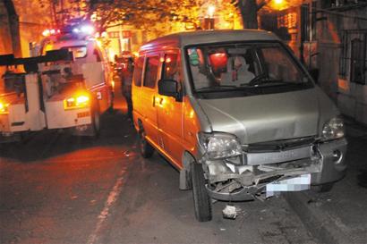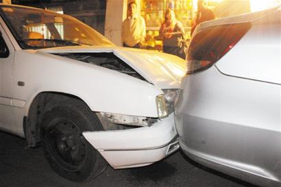10日下午5時20分許,記者聞訊趕到現場。在嫩江路17號門口,4輛轎車緊緊地連在一起,中間沒有一點空隙,最頭上的是一輛福特轎車,而在福特轎車前方20米處,停著一輛車頭嚴重受損的面包車,面包車后面還有一輛標致車的車頭被撞壞。