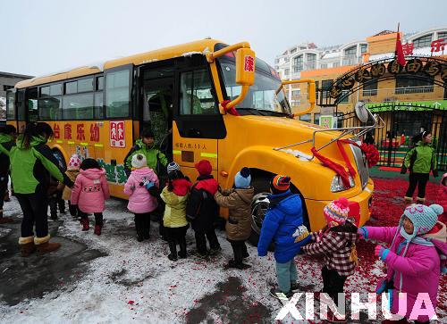 [提要] 12月10日,山東省煙臺市福山區康樂幼兒園一輛“大鼻子”仿美式校車正式投入使用。這款校車在造型上借鑒了歐美校車的長頭設計,配備有GPRS定位系統、專用停車信號臂、學童專用座椅、前部補盲鏡等,提高了校車的安全性。