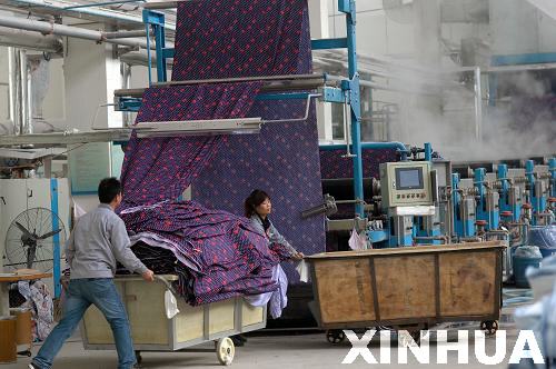 12月13日,在威海麗浦維爾印染公司,工人正在裝運印染的花布。新華社記者 郭緒雷 攝