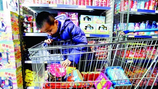 一位小朋友正在家長帶領下選購兒童煙火,這一車花了273元。