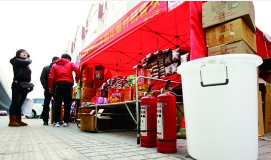 8日當天對煙花爆竹銷售點的采訪中,記者聽到最多的就是“安全”倆字,每個銷售人員的安全意識和風險意識都高于往年。各銷售點的負責人和銷售員都要持證上崗,即“2012年春節煙花爆竹零售安全知識考核合格證”。在攤點的顯眼位置,滅火器、滅火毯、大水桶等消防工具“嚴陣以待”,銷售人員告訴記者,為了防止天冷結冰,水桶里的水還要撒上鹽。