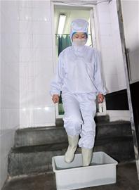 “食品安全絕對要放在首位,馬虎不得!被刎撠熑死顝姶蛄恐浾叩难b束,仔細檢查哪里不合格。“把頭發都塞進去!彼f,這里的工作人員進入大加工車間,必須過三道關,進入更衣室“全副武裝”后,還得洗手、泡鞋等消毒,再到風淋室吹風。