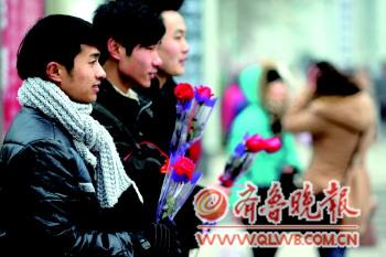 ①13日,在濰坊市東風街上,賣玫瑰花的人站在路邊等待顧客。14日就是“情人節”,因此很多人瞅準商機在街上推銷玫瑰花,趁機撈一筆“情人財”。