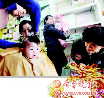[提要] 23日,在濟(jì)南市婦幼保健院附近,幾家嬰幼兒理發(fā)店生意火爆,吉祥喜慶洋溢在人們臉上。當(dāng)天是農(nóng)歷二月二“龍?zhí)ь^”的日子,今年又恰逢龍年,龍年的“龍?zhí)ь^”更有好兆頭,人們紛紛選擇在這一天理發(fā),成人圖個吉祥順利,小孩圖個健康成長。