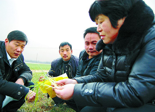 2月19日,農(nóng)技人員在麥田里“診治”小麥病蟲害。目前,正值小麥返青期,也是小麥病蟲害高發(fā)期,山東省郯城縣積極開展“百名專家包百村”活動,組織100多名農(nóng)技人員深入田間地頭,現(xiàn)場“問診開藥方”,幫助農(nóng)民解決生產(chǎn)中的實際問題,確保夏糧增產(chǎn)增收。(杜明涵)