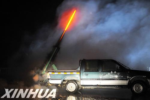 3月15日,氣象工作者在山東棗莊市臺兒莊區馬蘭屯鎮發射增雨火箭彈實施人工增雨作業。新華社發(高啟民 攝)