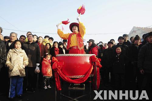 3月17日,在山東即墨市田橫鎮(zhèn)黃龍莊祭海節(jié)現(xiàn)場(chǎng),鼓手擂鼓助威。(俞方平 攝)