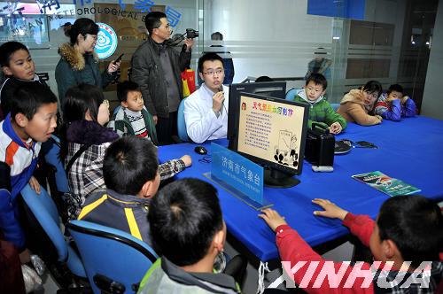3月25日,一名濟南市氣象臺的工作人員向前來參觀的市民講解氣象預報制作流程。新華社記者 徐速繪 攝